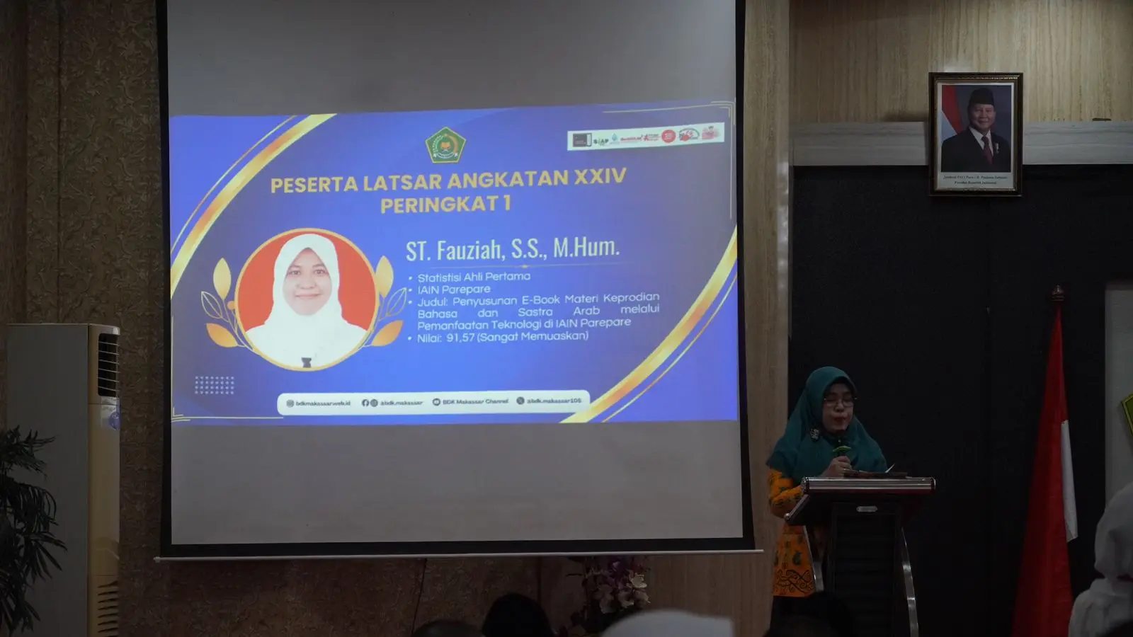 Humas IAIN Parepare---Kabar membanggakan kembali datang dari Institut Agama Islam Negeri (IAIN) Parepare. Setelah sebelumnya dua dosen IAIN Parepare meraih peringkat terbaik I pada Pelatihan Dasar (Latsar) CPNS yang diselenggarakan Balai Diklat Keagamaan (BDK) Makassar, kini prestasi serupa kembali terukir, Jum'at (14/11/25). Pada Angkatan XXIV Latsar CPNS 2025, St. Fauziah, dosen Program Studi Bahasa dan Sastra Arab (BSA), berhasil meraih Peringkat satu.